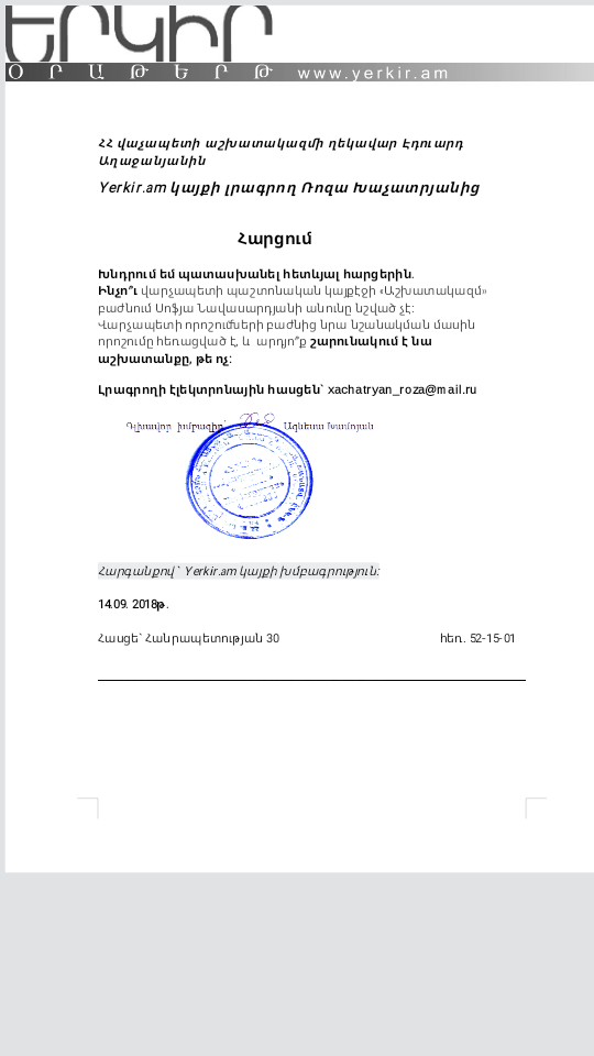 Case Description Վարչապետի աշխատակազմ: 2018 թվականի սեպտեմբերի 14-ին Yerkir.am առցանց պարբերկանի խմբագրության լրագրող Ռոզա Խաչատրյանը հարցում է ուղարկել Վարչապետի աշխատակազմ՝ խնդրելով տեղեկություն այն մասին, թե ինչու Վարչապետի պաշտոնական կայքի «Աշխատակազմ» բաժնում նշված չէ Սոֆյա Նավասարդյանի անունը և ինչու է Վարչապետի որոշումների ցանկից հեռացվել վերջինիս նշանակման մասին որոշումը: Լրագրողը խնդրել է պարզաբանել, թե արդյոք Սոֆյա Նավասարդյանը շարունակում է աշխատել: Վարչապետի աշխատակազմից լրագրողին ուղարկված նամակով աշխատակազմը խնդրել է 30-օրյա ժամկետ, սակայն այդպես էլ չի պատասխանել հարցմանը: