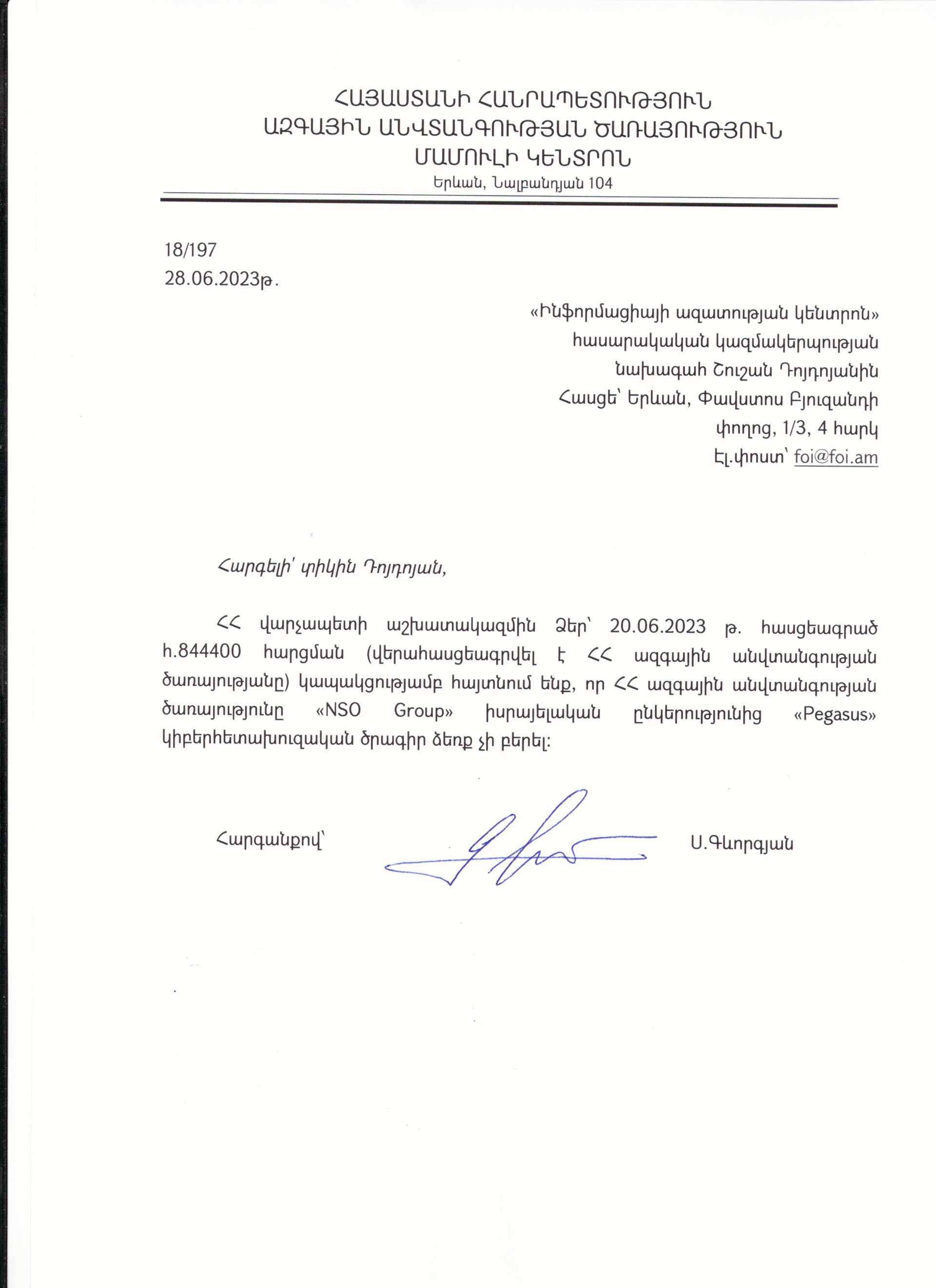 Case Description Պեգասուս։ Ինֆորմացիայի ազատության կենտրոնը հունիսի 20-ին դիմէլ է Վարչապետի աշխատակազմ՝ խնդրելով տրամադրել տեղեկություն այն մասին, թե 2020 թվականից մինչ օրս ընկած ժամանակահատվածում ՀՀ Կառավարությունը «NSO Group» իսրայելական ընկերությունից արդյոք ձեռք է բերել «Pegasus» ծրագիրը, որը, ըստ ընկերության կայքի՝ www.nsogroup.com-ի, կիբերհետախուզական է և եթե այո, ապա որքան գումար է ծախսվել այդ նպատակով: Վարչապետի աշխատակազմը հարցումը վերահասցեագրել է ԱԱԾ, որն էլ պատասխան գրությամբ տեղեկացրել է որ կառավարությունը նման ծրագիր ձեռք չի բերել։