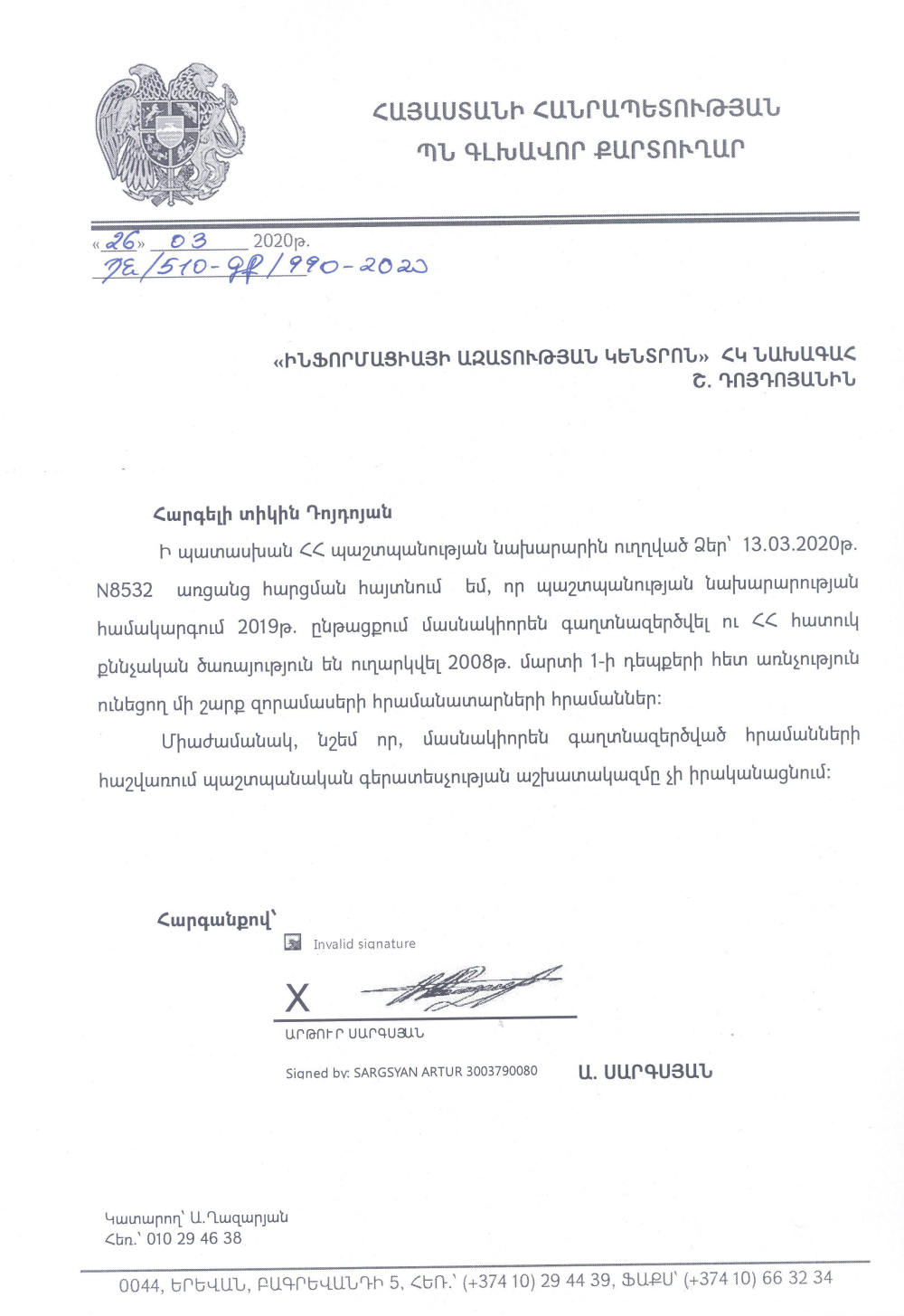 Հարցման նկարագրություն Գաղտնազերծված փաստաթղթեր 2019: Ինֆորմացիայի ազատության կենտրոնը 2020 թվականի փետրվարի 28-ին տեղեկություն ստանալու հարցում էր ուղարկել՝ խնդրելով տրամադրել Նախարարության աշխատակազմի տնօրինության տակ գտնվող այն փաստաթղթերի ցանկը, որոնք գաղտնազերծվել են 2019 թվականի ընթացքում, ինչպես նաև պաշտոնական կայքի այն էջի հղումը, որտեղ հրապարակվել են գաղտնազերծված փաստաթղթերը կամ դրանց բացակայության վերաբերյալ տեղեկությունները: