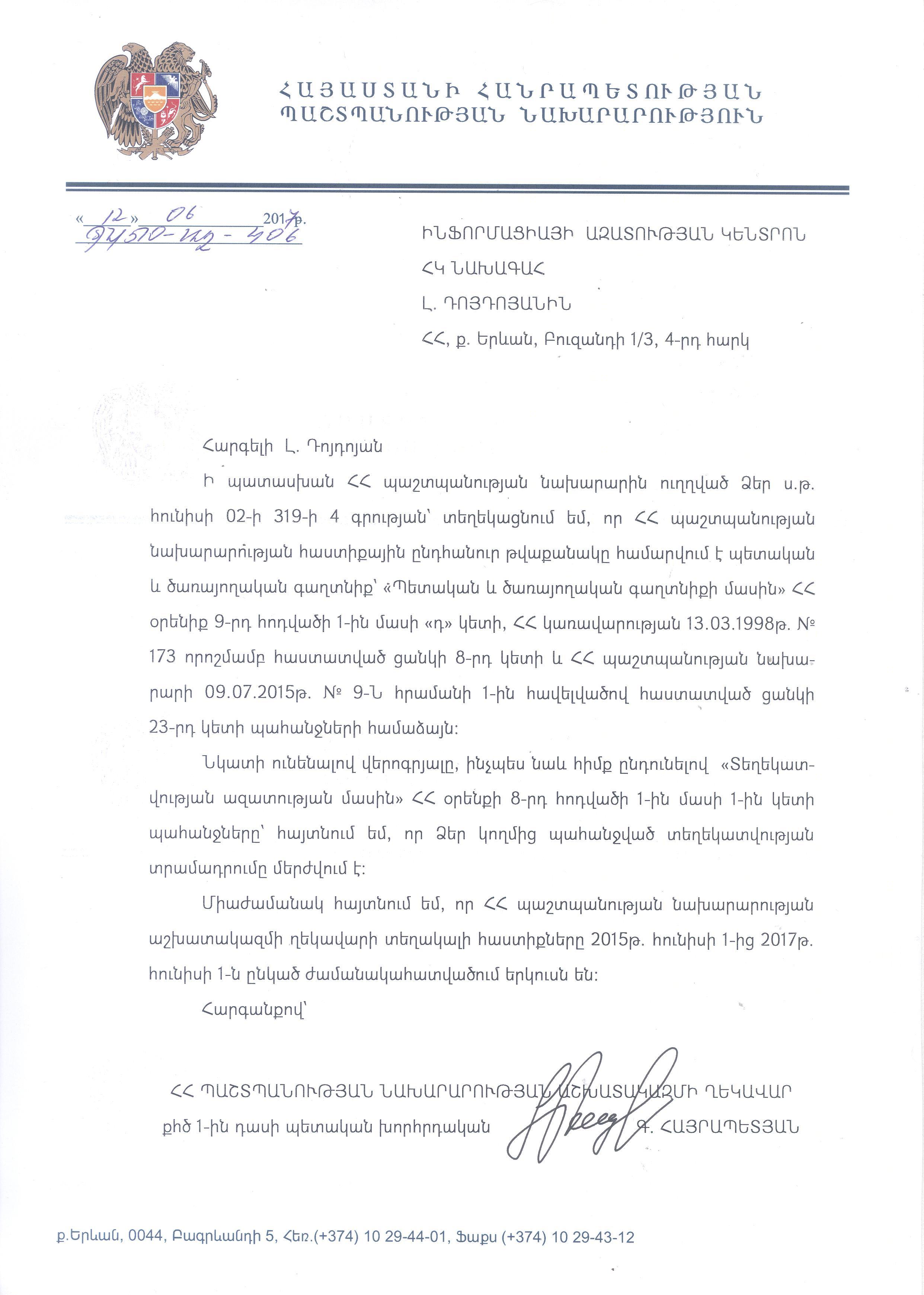 Case Description Հաստիքային աշխատակից, փորձագետ, աշխատակազմի ղեկավարի տեղակալ: 2017թ.-ի հունիսի 2-ին Ինֆորմացիայի ազատության կենտրոնը տեղեկություն ստանալու էլեկտրոնային հարցմամբ դիմել էր նախարարություն՝ խնդրելով տեղեկություններ 2015, 2016, 2017թթ.-ի հունիսի 1-ի դրությամբ նախարարությունում հաստիքային աշխատակիցների, փորձագետների և աշխատակազմի ղեկավարի տեղակալների վերաբերյալ: Նախարարությունը թերի պատասխան է տրամադրել 7 աշխատանքային օր անց: Պատասխանը համարվել է թերի, քանի որ նախարարությունը հաստիքային ընդհանուր թվաքանակը համարել է գաղտնիք՝ հղում անելով <<Պետական և ծառայողական գաղտնիքի մասին>> ՀՀ օրենքի 9-րդ հոդվածի 1-ին մասի <<դ>> կետին: Տեղեկություն է տրամադրվել միայն 2015 հունիսի 1-ի-ց 2017թթ.-ի հունիսի 1-ի միջև ընկած ժամանակահատվածում աշխատակազմի ղեկավարի տեղակալի վերաբերյալ: