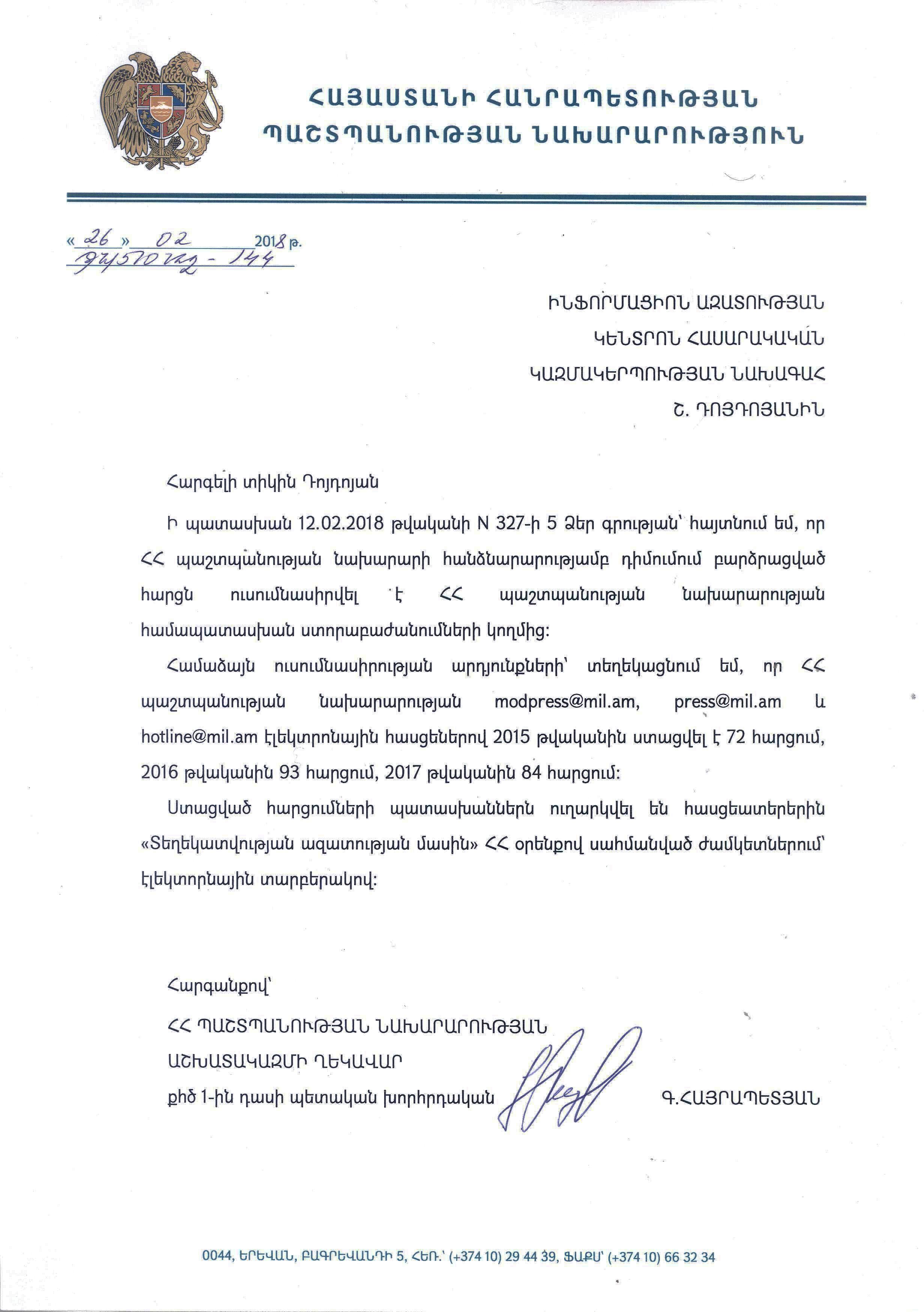 Case Description Էլեկտրոնային հարցումներ: Ինֆորմացիայի ազատության կենտրոնը տեղեկություն ստանալու էլեկտրոնային հարցմամբ 2018 թ-ի փետրվարի 12-ին դիմել էր նախարարություն` խնդրելով տեղեկություններ 2015թ․-ին, 2016թ․-ին և 2017 թ․-ին ստացված էլեկտրանային հարցումների վերաբերյալ: Նախարարությունը տրամադրել է պատասխան հարցումն ուղարկելուց 5 աշխատանքային օր անց՝ խնդրելով լրացուցիչ ժամանակ հարցմանը պատասխան տրամադրելու համար: Փետրվարի 26-ին նախարարությունը տրամադրել է հայցված տեղեկությունը: