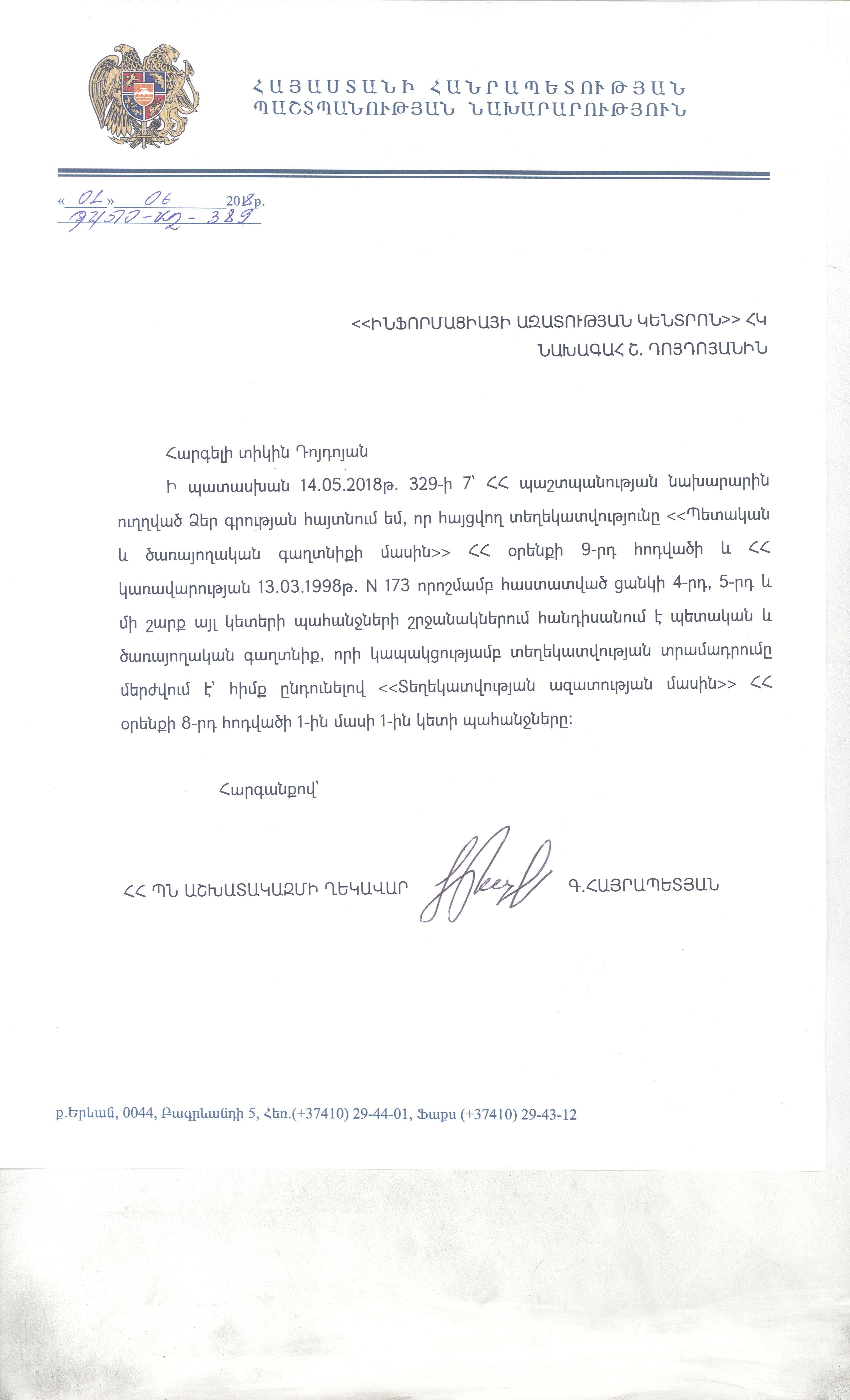 Case Description Ֆինանսական հաշվետվություն: Ինֆորմացիայի ազատության կենտրոնը տեղեկություն ստանալու էլեկտրոնային հարցմամբ 2018 թ.-ի մայիսի 23-ին դիմել էր ՊՆ` խնդրելով տրամադրել նախարարության` 2018 թվականի բյուջեի կատարման 1-ին եռամսյակի ֆինանսական հաշվետվությունը: Նախարարությունը անհիմն կերպով մերժել է պատասխանի տրամադրումը: ՊՆ պատասխանը համարել ենք անօրինական մերժում, քանի որ նախարարությունը նախ լրացուցիչ ժամանակ էր խնդրել պատասխանը տրամադրելու համար, իսկ այնուհետեւ 4 օր անց մերժել։ ՏԱ մասին օրենքի համաձայն՝ մերժումը պետք է տրամադրվի 5 օրյա ժամկետում, իսկ լրացուցիչ ժամանակ խնդրում են բացառապես տեղեկատվության տրամադրելու եւ ոչ մերժումը հիմնավորելու համար: