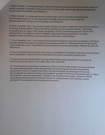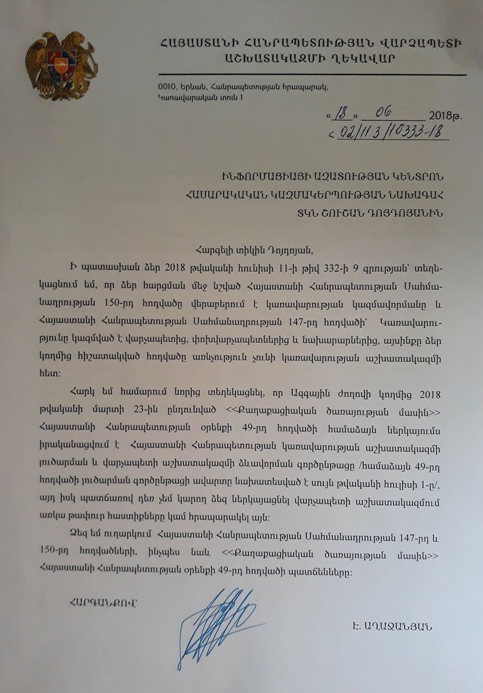 Case Description Թափուր հաստիքներ: Ինֆորմացիայի ազատության կենտրոնը տեղեկություն ստանալու կրկնակի հարցմամբ 2018 թ-ի հունիսի 11-ին դիմել էր ՀՀ վարչապետին՝ խնդրելով տրամադրել աշխատակազմում առկա թափուր հաստիքների ցանկն ու հրապարակման աղբյուրը: Կառավարությունը անհիմն կերպով մերժել է տեղեկության տրամադրումը: Հիշեցնենք, որ ԻԱԿ-ը 2018 թ-ի մայիսի 23-ին արդեն դիմել էր ՀՀ կառավարության աշխատակազմ՝ խնդրելով տրամադրել թափուր հաստիքների ցանկն ու աղբյուրը, բայց Կառավարության աշխատակազմը անհիմն պատասխան էր տրամադրել 7 աշխատանքային օր անց: http://www.givemeinfo.am/hy/case/2384/ Պատասխանը անհիմն է համարվել, քանի որ թեև Կառավարության աշխատակազմը շարունակում է նոր նշանակումներ անել, սակայն պատասխանում նշում է, որ թափուր հաստիքների մասին տեղեկատվություն առկա չէ։