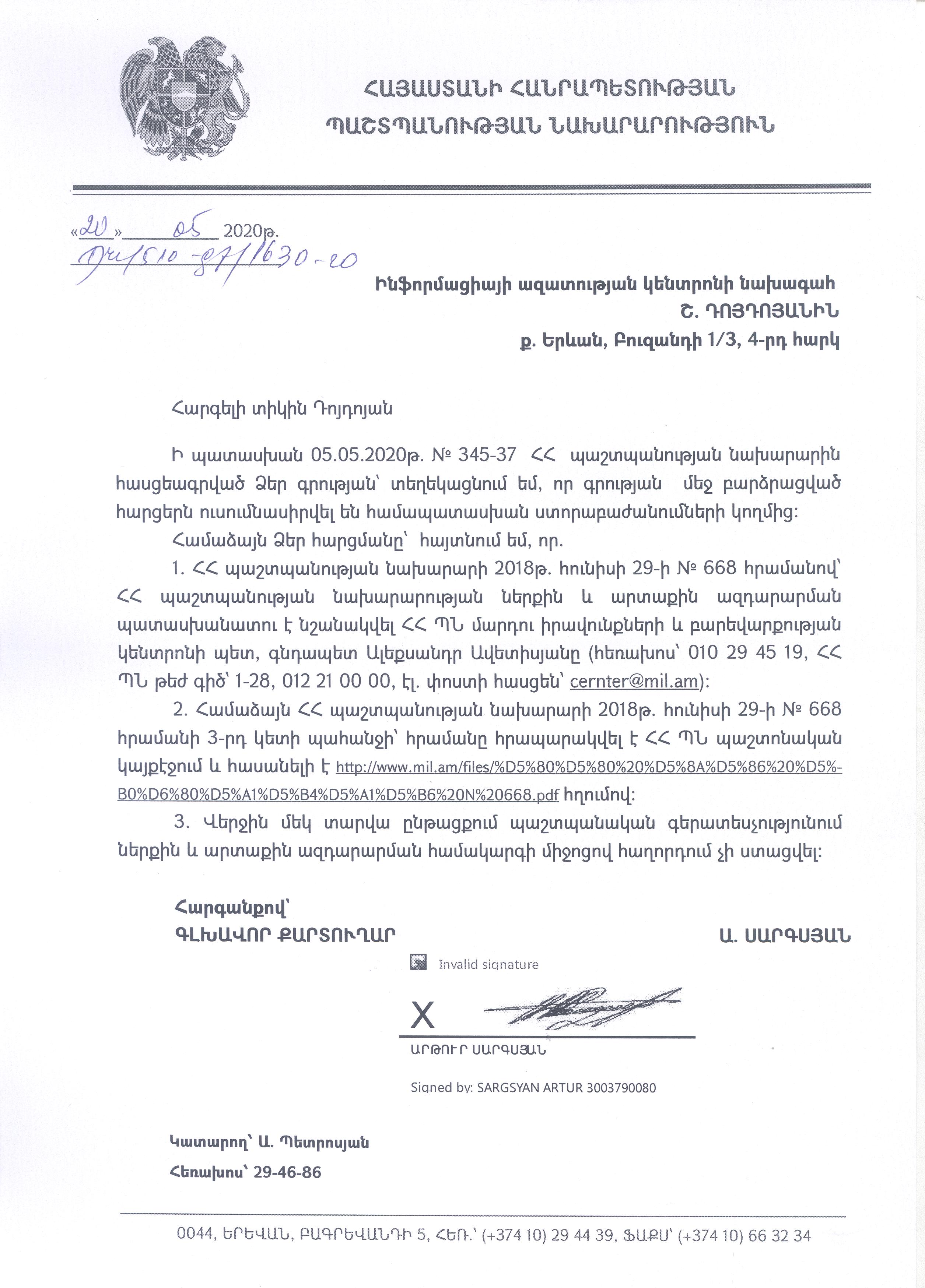 Case Description Ազդարարման համակարգ։ 2020թ. մայիսի 5-ին Ինֆորմացիայի ազատության կենտրոնը հարցում էր ուղարկել պետական կառավարման մի շարք մարմիններ՝ խնդրելով տրամադրել կառույցի ներքին և արտաքին ազդարարման պատասխանատու անձի անունը, զբաղեցրած պաշտոնը և կոնտակտային տվյալները, ինչպես նաև պաշտոնական կայքի այն էջի հղումը, որտեղ ներկայացված են վերոնշյալ տվյալները։ Կառույցներին խնդրել էինք ներկայացնել նաև տվյալներ, թե տվյալ կառույցում ներքին և արտաքին ազդարարման քանի դեպք է գրանցվել վերջին մեկ տարվա ընթացքում։