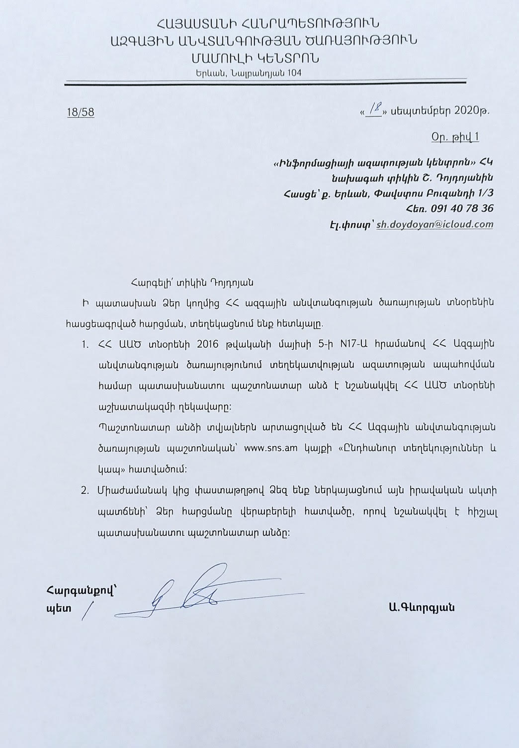 Case Description ՏԱ պատասխանատու: Ինֆորմացիայի ազատության կենտրոնը 2020թ.-ի սեպտեմբերի 14-ին դիմել է ՀՀ Ազգային անվտանգության ծառայություն՝ խնդրելով տրամադրել տեղեկատվություն այն մասին, թե ով է գերատեսչությունում տեղեկատվության ազատության համար պատասխանատու պաշտոնատար անձը` ( խնդրել ենք նշել անունը, ազգանունը, իր հետ կապի միջոցները), ինչպես նաև տրամադրել այն իրավական ակտի պատճենը, որով նշանակվել է ՏԱ համար պատասխանատու պաշտոնատար անձը: