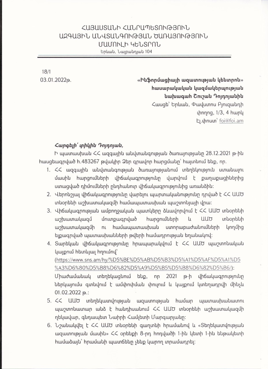 Case Description Տեղեկատվության ազատություն։ 2021 թ․ դեկտեմբերի 28-ին Ինֆորմացիայի ազատության կենտրոնը տեղեկություն ստանալու հարցումներ էր ուղարկել պետական կառավարման և տեղական ինքնակառավարման մի շարք մարմիններ՝ խնդրելով տրամադրել կառույցի տեղեկատվության ազատության վերաբերյալ տեղեկություններ․ վարում է արդյո՞ք կառույցը տեղեկություն ստանալու հարցումների առանձին վիճակագրություն, ինչպիսի աղբյուրներից է այն ձևավորվում և ինչպես է հրապարակվում, ունի արդյոք կառույցը ՏԱ պատասխանատու անձ և արդյոք վերջինս մասնակցել է թեմատիկ դասընթացների։ Կառույցը տրամադրել է ոչ պատշաճ մերժում, խախտվել է ՏԱ օրենքի 11-րդ հոդվածի պահանջը: