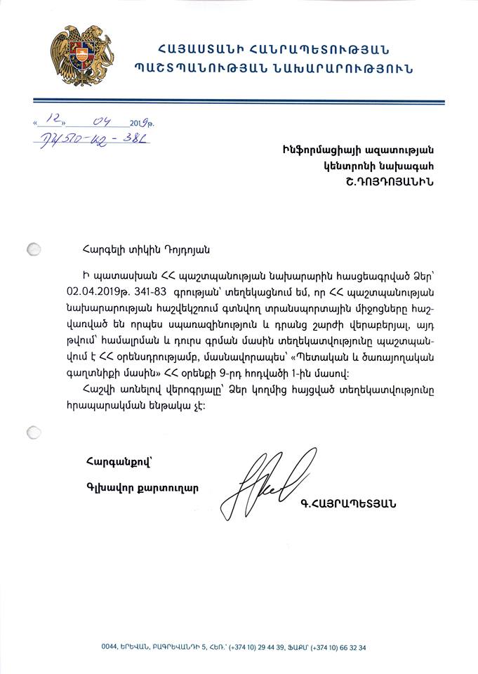 Հարցման նկարագրություն Ծառայողական մեքենաներ: Ինֆորմացիայյի ազատության կենտրոնը տեղեկություն ստանալու նպատակով 2019 թվականի ապրիլի 2-ին դիմել էր Պաշտպանության նախարարություն՝ խնդրելով տրամադրել տեղեկություն այն մասին, թե 2018 թ.-ի հունիսի 1-ից նախարարությունում որքան ծառայողական մեքենա է կրճատվել, որքան վարորդ և մեքենաներից քանիսն են եղել չշահագործված: