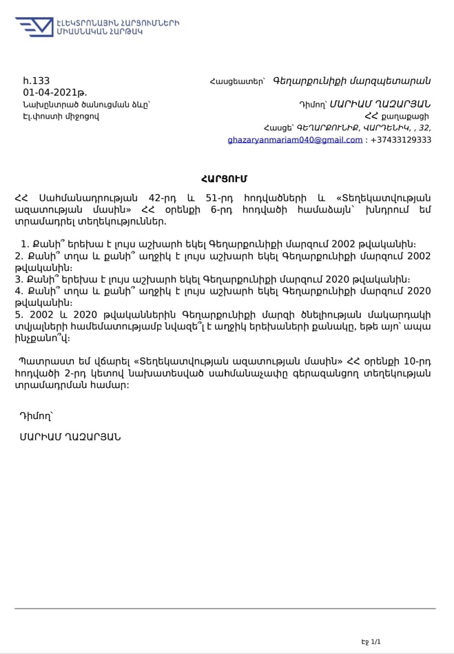 Հարցման նկարագրություն Ծնելիություն Գեղարքունիք։ 2021 թվականի ապրիլի 1-ին քաղաքացի Մարիամ Ղազարյանը տեղեկություն ստանալու հարցում է ուղարկել Գեղարքունիքի մարզպետարան՝ խնդրելով տրամադրել մարզի ծնելության վերաբերյալ տվյալներ2002 և 2020 թվականների համար։ Պատասխան գրությամբ մարզպետարանը նշել է, որ հարցմամբ պահանջված տեղեկությունները կարելի է գտնել մարզպետարանի կայք համապատասխան ստորաբաժանման էջերում։ Պատասխանը համարվել է թերի, քանի որ չի տրամադրվել հարցերի պատասխանները, իսկ տրմադրված աղբյուրը ներկայացված չէ կոնկրետ հղումով։