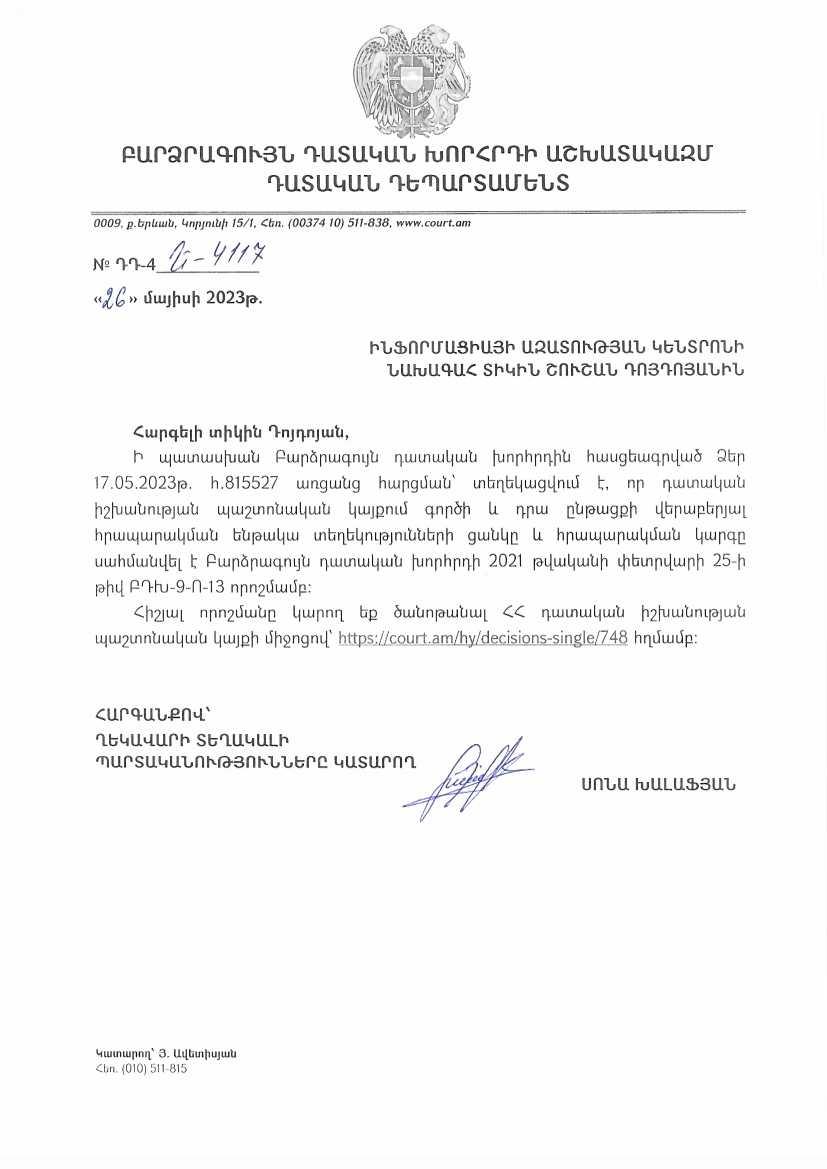 Հարցման նկարագրություն Հրապարակայնության կանոնակարգ։ ՀՀ դատական օրենսգրքի 11-րդ հոդվածի 9-րդ կետը սահմանում է․ «Դատական իշխանության պաշտոնական կայքում հրապարակվում են գործի և դրա ընթացքի վերաբերյալ տեղեկությունները, որոնց ցանկը և հրապարակման կարգը սահմանում է Բարձրագույն դատական խորհուրդը»: Ինֆորմացիայի ազատության կենտրոնը մայիսի 17-ին դիմել է Բարձրագույն դատական խորհուրդ՝ խնդրելով տրամադրել տեղեկություն այն մասին, թե արդյոք Բարձրագույն դատական խորհուրդը մշակել և ընդունել է վերոնշյալ կարգը։ Եթե ոչ, ապա խնդրում ենք տեղեկացնել, թե երբ է նախատեսվում մշակել և ընդունել վերոնշյալ կարգը։ Եթե այո, ապա խնդրում ենք տրամադրել կարգը կամ ակտիվ հղում, որով կարող ենք ծանոթանալ կարգի բովանդակությանը։ ԲԴԽ-ն սահմանված ժամկետում տրամադրել է ընդունված որոշման ակտիվ հղումը։