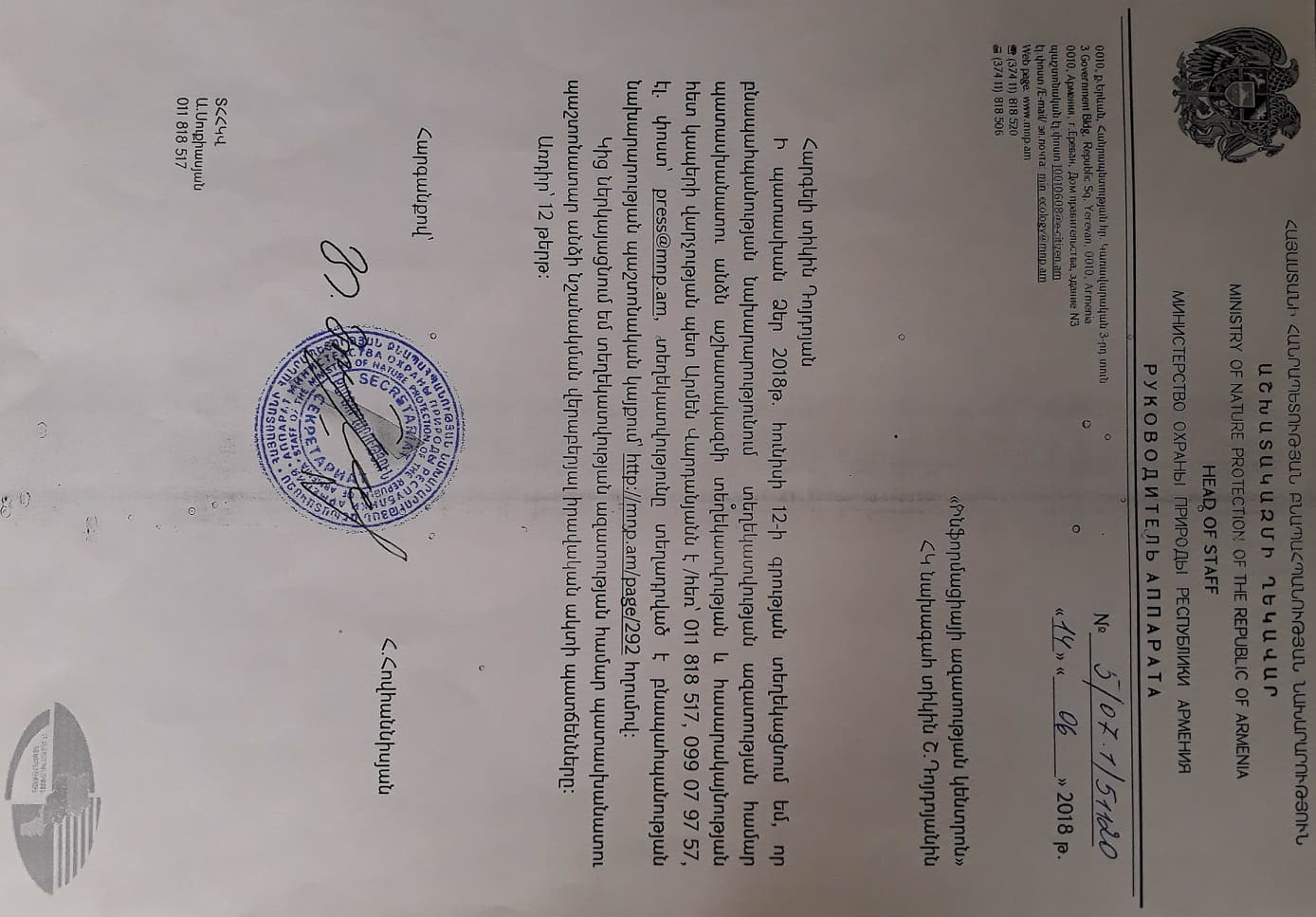 Case Description ՏԱ պատասխանատու: Ինֆորմացիայի ազատության կենտրոնը տեղեկություն ստանալու էլեկտրոնային հարցմամբ 2018 թ-ի հունիսի 12-ին դիմել էր նախարարություն` խնդրելով տրամադրել տեղեկություն գերատեսչությունում տեղեկատվության ազատության համար պատասխանատու պաշտոնատար անձի վերաբերյալ: Նախարարությունը լիարժեք պատասխան է տրամադրել հարցումն ուղարկելուց 4 աշխատանքային օր անց: