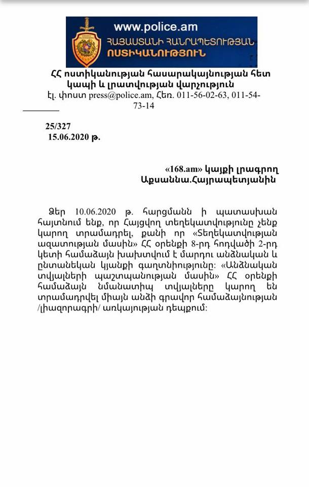 Հարցման նկարագրություն Ոստիկանապետի պարգևատրում։ Ինֆորմացիայի ազատության կենտրոն է դիմել 168Ժամ-ի լրագրող Աքսաննա Հայրապետյանը՝ խնդրելով աջակցել տեղեկություն տրամադրելու հարցում։ 2020 թվականի հունիսի 10-ին լրագրողը հարցում է ուղարկել ՀՀ ոստիկանություն՝ խնդրելով տրամադրել տեղեկություններ այն մասին, թե արդյոք ՀՀ նախկին ոստիկանապետ Արման Սարգսյանը պաշտոնանկությունից առաջ ինքն իրեն պարգևատրել է զենքով, և եթե այո, ապա ինչ զենքով։ Ոստիկանությունը հրաժարվել է տրամադրել պահանջվող տեղեկությունը՝ նշելով, թե տեղեկությունը անձնական տվյալներ է պարունակում։