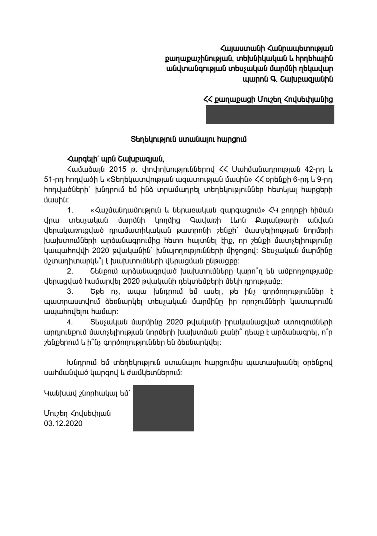 Հարցման նկարագրություն Քաղաքացի Մուշեղ Հովսեփյանը 2020 թ. դեկտեմբերի 3-ին հարցում է ուղղել ՀՀ քաղաքաշինության, տեխնիկական անվտանգության և հրդեհային անվտանգության տեսչական մարմնի ղեկավարին։ Հարցումը Գավառի Լևոն Քալանթարի անվան վերակառուցված դրամատիկական թատրոնի շենքում տեսչական մարմնի կողմից մատչելիության նորմերի խախտումների վերացման ընթացքի և մշտադիտարկման, ինչպես նաև 2020 թվականին իրականացված ստուգումների արդյունքում մատչելիության նորմերի խախտման դեպքերի արձանագրման վերաբերյալ է։ Պատասխանը լիարժեք է և ներկայացվել է ժամանակին։