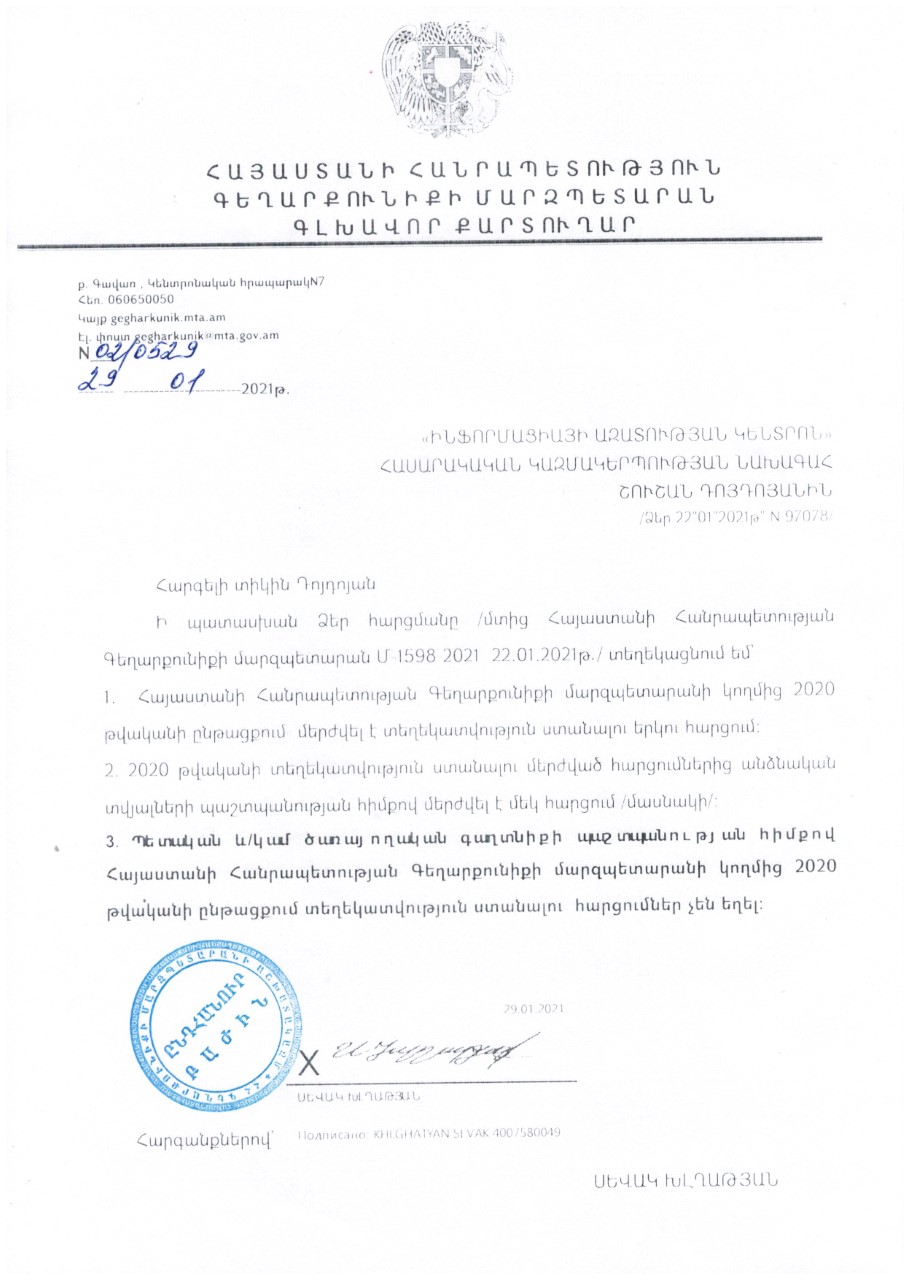 Հարցման նկարագրություն Մերժված հարցումներ։ Ինֆորմացիայի ազատության կենտրոնը 2020 թվականի հունվարի 22-ին տեղեկություն ստանալու հարցում է ուղարկել պետական կառավարման և տեղական ինքնակառավարման մարմիններ՝ խնդրելով տրամադրել տեղեկություններ այն մասին, թե քանի տեղեկություն ստանալու հարցում է մերժել կառույցը 2020 թ. ընթացքում, հստակեցնել, թե մերժված տեղեկություն ստանալու հարցումներից քանիսն են մերժվել անձնական տվյալների, և քանիսը՝ պետական և/կամ ծառայողական գաղտնիքի պաշտպանության հիմքով։ Գեղարքունիքի մարզպետարանը պատասխան գրությամբ տեղեկացրել է, որ նշված ժամանակահատվածում անձնական տվյալների պաշտպանույան հիմքով մասնակի մերժել է 1 հարցում։